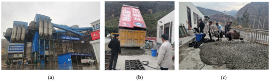 Production, transportation and pouring of concrete: (a) concrete mixing system at the construction site; (b) concrete transportation with thermal insulation dump truck; (c) pouring of specimens.