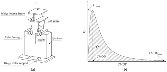 Wedge-splitting fracture test: (a) diagram of the loading device and (b) schematic diagram of the FH-CMOD curve.