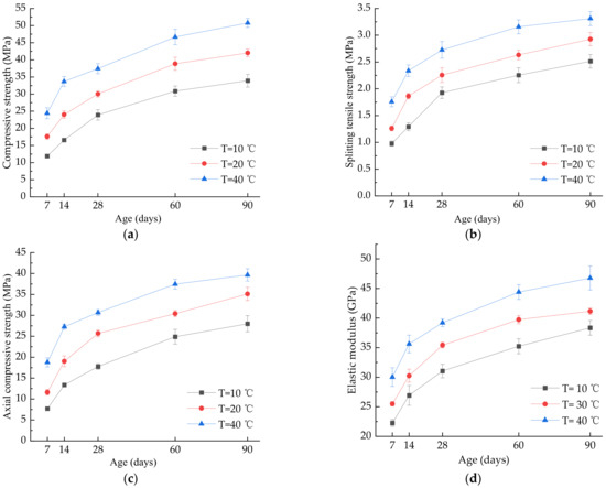 The variation of strength parameters of low-heat cement gallery concrete with age when the curing humidity is 98% and curing temperature is 10 °C, 20 °C and 40 °C: (a) compressive strength; (b) splitting tensile strength; (c) axial compressive strength and (d) static compressive elastic modulus.