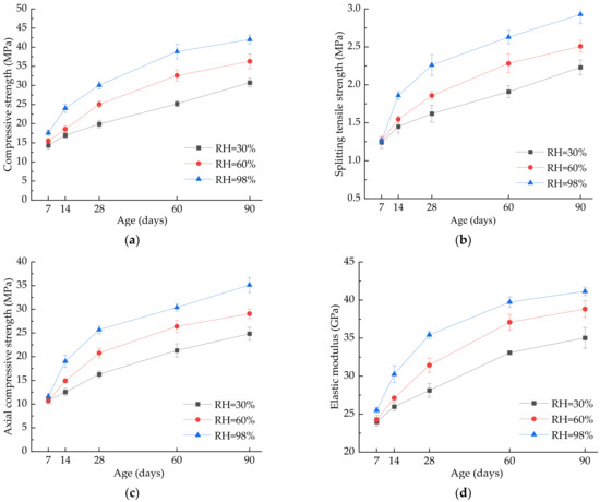 The variation of strength parameters of low-heat cement gallery concrete with age when the curing temperature is 20 °C and curing humidity is 30%, 60% and 98%: (a) compressive strength; (b) splitting tensile strength; (c) axial compressive strength and (d) static compressive elastic modulus.