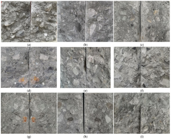 In addition to age factor, curing temperature and humidity would also affect the failure modes of the fracture surfaces of the specimens. Compare Figure 9c,f,g, the fracture surface under different curing temperature conditions at 28 days, and Figure 9c,h,i, the fracture surface under different curing humidity conditions at 28 days; with the increase in temperature and humidity, the failure mode of the fracture surface gradually changes, from the interface failure between the aggregate and the mortar to the splits of the aggregates. This is mainly because higher a curing temperature and humidity contribute to the growth of the bond strength of aggregate and mortar, which leads to a macroscopic change in the failure mode of the fracture surface.