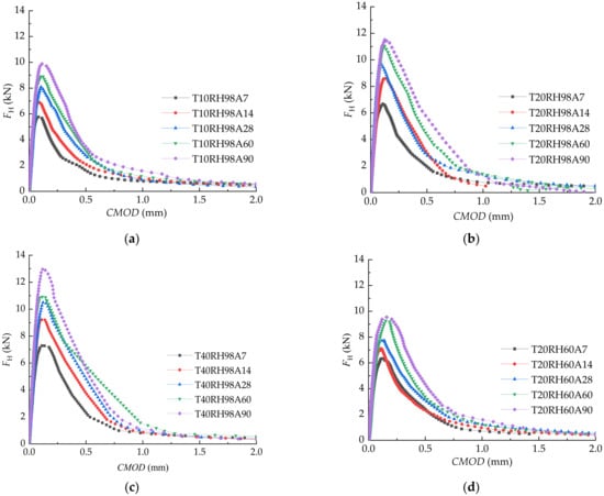 From Figure 10a–c, it can be seen that, at a given age, the higher the curing temperature, the greater the peak load of the specimen. Taking the peak load at different curing temperatures, 90 days as an example, the curing humidity is 98% and the peak load, at a curing temperature of 40°C, is 23.36% and 9.02% larger than the peak loads at 10 °C and 20 °C, respectively. Similarly, looking at Figure 10b,d,e, it can be seen that, at a given age, the higher the curing humidity, the greater the peak load of the specimen. When the curing temperature is 20 °C and the curing humidity is 98%, the peak load is 32.07% and 18.74% larger than the peak load at 30% and 60%, respectively. In addition, it can be seen from Figure 10 that, under a given curing temperature and humidity, the initial slope and peak load of the load–CMOD curves both increase with the increase in age. This is mainly because the higher the age, the more sufficient the hydration degree of the cement under the same curing conditions, which increases the mechanical properties and bearing capacity of the concrete.