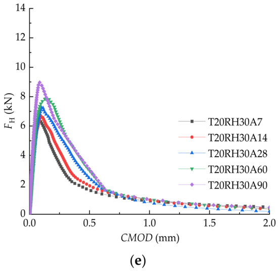 Load–crack mouth opening displacement curves of wedge-splitting specimens under different curing conditions: (a) T = 10 °C, RH = 98%; (b) T = 20 °C, RH = 98%; (c) T = 40 °C, RH = 98%; (d) T = 20 °C, RH = 60%; (e) T = 20 °C, RH = 30%.