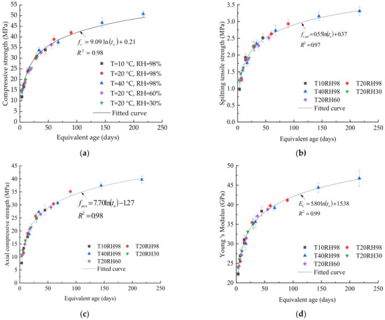 where αu is the final degree of hydration; α0 is the initial degree of hydration; m is defined as a microscopic coefficient; γ is the water diffusion coefficient; H is the average value of the curing humidity of the concrete during time interval . The remaining variables are the same as the ones in Equation (10). To ensure the consistency of Equations (10) and (11), and for simplicity, the constants in Equation (11) are chosen as follows in this study: αu = 1, α0 = 0, m = 0, γ = 1. It should be noted that normally these constants can be calibrated by the best fit of the test results. However, these parameters only change the calculation results of equivalent age and will not affect the prediction results of concrete properties, hence, they can be pre-set according to the relevant research results [30].