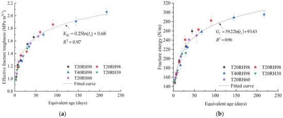 Relationship between fracture parameters and equivalent age: (a) equivalent fracture toughness; (b) fracture energy.