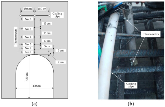 Arrangement of thermometers in gallery concrete: (a) design layout drawing; (b) actual buried thermometers.