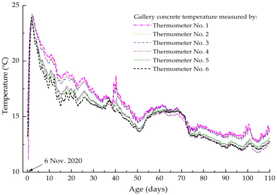Hourly temperature history of the gallery concretes at different positions measured by the pre-embedded thermometer.