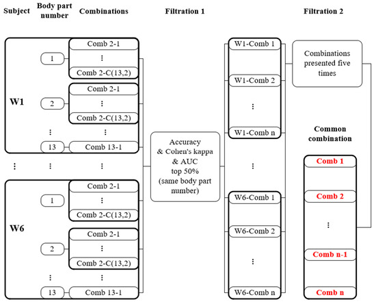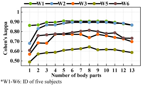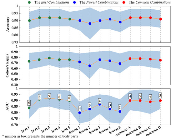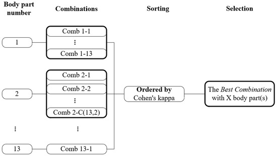 Three combination types were compared in this study. First, the best body part combination (the best combination (BC)) was selected based on the Cohen’s kappa values of each subject. As explained in Figure 2, we sorted the body part combinations according to Cohen’s kappa. The combination with the highest value of Cohen’s kappa was named the BC.