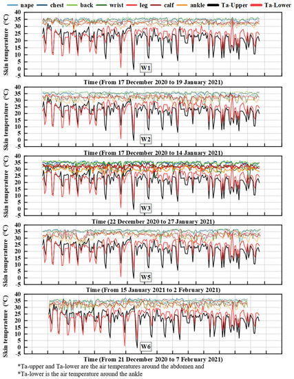 This study was not carried out in a controlled climate chamber, but rather under daily conditions, which resulted in an unsteady process as subjects could change their location and activity freely. Therefore, it was important to record the thermal experiences of the subjects W1–W6. Figure 5 shows the real-time skin temperature of the subjects.