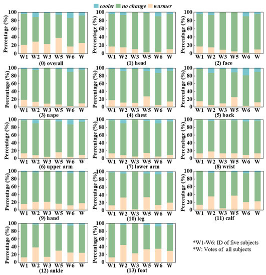 Unlike skin temperature, the thermal preference of local body parts is directly related to overall thermal comfort and can be used to predict the optimal management of the HVAC system needed to create a comfortable space [42]. If we knew which body part(s) most strongly affect overall thermal comfort, it would be possible to adjust overall thermal comfort through local thermal adjustments. When Zhang [43] established a thermal sensation model, the chest, back, and pelvis were considered the dominant body parts affecting overall thermal sensation and the thermal sensation group (from −4 (extremely cold) to 4 (extremely hot)) contained more body parts that governed overall thermal sensation. Similarly, if the effect of local thermal preferences on overall thermal preference was clear, we could determine which body part(s) make the greatest contribution to overall thermal preference. It could also provide a reference for suitable skin temperature measurement locations.