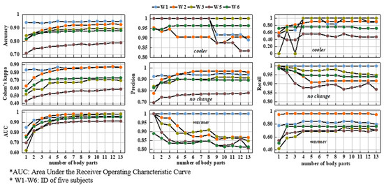 As shown in Figure 13, we found an increasing trend of accuracy as more body parts were included in the prediction. No obvious decrease occurred for any of the metrics when the number of body parts increased. The combinations containing 1–5 body parts had an accuracy of over 0.80 (except for W5). For the Cohen’s kappa, the combinations with 4–9 body parts could meet the requirements of the three metrics (except for W5) and according to the AUC, 5–8 body parts were sufficient to predict overall thermal preference.
