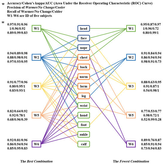 For example, the thermal preference of W1 could be predicted using five body parts (the face, nape, chest, wrist, and leg) with an accuracy of 0.97, Cohen’s kappa of 0.91, AUC of 0.96, and precision and recall above 0.83. This meant that the model established for W1 was reliable. However, as shown in Figure 10, the BC for each subject still consisted of 5–9 body parts, which meant that a large number of inputs was required for the prediction and many questionnaires had to be completed. This was the main cause of the subjects’ aversion to the questionnaire.