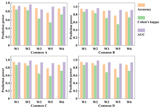 The subject-averaged prediction power of four common combinations for subjects W1-W6.