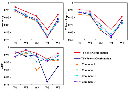 The accuracy, Cohen’s kappa, and AUC of the four selected common combinations in the validation.