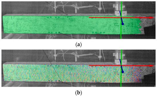 Figure 3 shows the examined beam covered in the pattern. It is also possible to track the displacement of selected points—stickers are used as measurement markers to this end (Figure 2b, Figure 3 and Figure 21a). These markers were applied to the strain measurements. On this basis, extensometers were created. This has been described in more detail in Section 3.4.