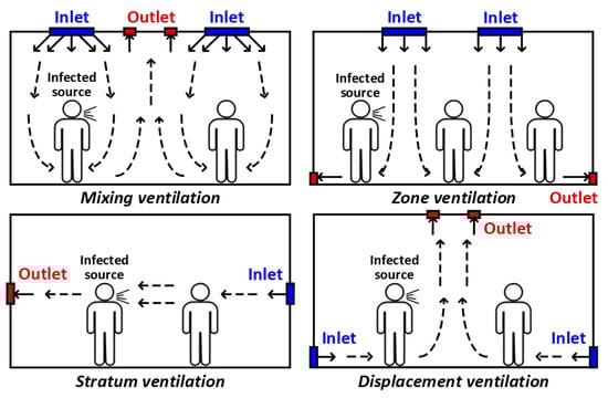 To address the issue of increased infection risk induced by traditional ventilation modes, the development of novel ventilation modes appears to be a potential, mainly including displacement ventilation (DV), stratum ventilation (SV), zone ventilation (ZV), etc. (as shown in Figure 1) []. Based on the principle of displacing contaminated indoor air with fresh air from outside, DV can provide an advantage in reducing pollutant concentration and energy saving []. Luo et al. carried out a full-scale experiment to investigate the influence of the inlet/outlet arrangement of DV system on the performance of energy savings, which has been achieved by 47.7–65.9%. Kang et al. [] used a RNG k-ɛ turbulent model to compare the dispersion of droplets from human coughing between MV and DV. The results showed that the DV strategy was more effective in removing droplets from an indoor room and lowering the infection risk. SV is able to deliver air directly to the breathing zone at a larger supply air rate through the inlets installed on the side wall []. The experiment conducted by Tian et al. [] showed that SV removed the contaminants effectively to maintain good inhaled air quality, which was superior to the MV system. The simulation work by Li et al. [] and Lu et al. [] both illustrated that SV can significantly reduce the concentration of contaminants in the breathing region, and effectively decrease the risk of airborne transmission. The principle of ZV is to divide the indoor zone into subzones using vertical jets, which can be favorable to separate contaminated regions from susceptible ones and diminish the exposure risk to viral pollutants []. Through the experimental study, Cao et al. reported that the utilization of ZV could decrease the infection risk by about 40% when compared to MV [].