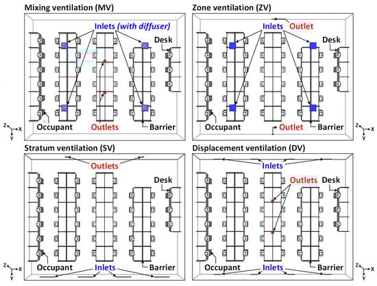 To investigate the ventilation performance and infection possibility in large public room under different ventilation modes and locations of infected sources, a full-scale office model was adopted, with the dimensions of 12.4 m (X) × 9.8 m (Y) × 2.6 m (Z). Figure 2 displays the schematic diagram of various ventilation modes, consisting of mixing ventilation (MV), zone ventilation (ZV), stratum ventilation (SV) and displacement ventilation (DV). Table 1 illustrates the detailed information of supply air inlets and return air outlets for these ventilation modes. In the ventilation mode of MV, a square diffuser was used at the inlet. The total area of inlets and outlets remained the same as 1 and 0.08 m2, respectively. Previous work has reported that the minimum required supply air rate for an air-conditioning system in this office room should be adjusted to 1.73 m3/s with the percentage of outdoor air of 0.31 and minimum fresh air of 0.35 m3/s, in order to deliver sufficient ventilation air to each occupant []. In this study, the average supply air velocity at the inlets was set as 1.73 m/s for all the ventilation modes. In total, there were 43 occupants and 8 rows of desks in the office room. The size of a desk was set as 0.7 m (X) × 1.2 m (Y) × 0.8 m (Z). The spacing between each row of desks was defined as 1.7 m. The height of the physical barriers was optimized as 0.6 m above the desk surface to show effective performance in obstructing pollutant dispersion and reducing infection risk, which has been verified in the previous study [].