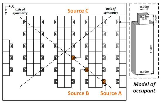 In this work, three locations of infected occupant (source) of A, B and C were designed, as shown in Figure 3. These infected sources were located at the axis of symmetry in the office, with a distance from the center of the room of 5, 3 and 1 m, respectively. This work employed a simplified rectangular model to represent the occupants in an office to significantly reduce the computational cost, which has been validated by []. The model of occupant was utilized with a body size of 0.4 m (length) × 0.3 m (width) × 1.1 m (height), a head size (including a neck) of 0.2 m (length) × 0.2 m (width) × 0.2 m (height) and a mouth size of 0.02 m (length) × 0.02 m (height). Regarding an infected source, continuous coughing was assumed with an average airflow velocity of 13 m/s downwards at 27.5° []. For other occupants, the average breathing rate was set at 0.7 m/s. The temperature of the occupant’s body, head and mouth was set as 24, 34 and 36 °C. The airflow temperature for coughing and breathing of occupants was assumed as 36 °C.