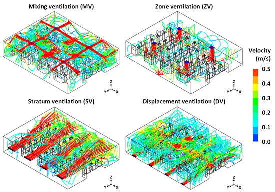 Streamline distribution of different ventilation modes in the office, including mixing ventilation (MV), zone ventilation (ZV), stratum ventilation (SV) and displacement ventilation (DV).