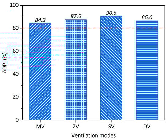 Then, the ADPI was further used to quantify the ventilation performance of various ventilation modes in this study. Figure 5 presents the calculated ADPI values for ventilation modes of MV, ZV, SV and DV. It can be found that the airflow distribution performance under these ventilation modes reached above 80%, which is a critical value for acceptable ADPI. Of these modes, SV possessed the maximum ADPI value of 90.5%, which was increased by 6.3% compared to 84.2% of MV. ZV and DV appeared to have the ability to improve ventilation efficacy at a certain level, by increasing 3.4% and 2.4% of ADPI values, respectively, in comparison to MV. With the foundation of ensuring sufficient supply air rate, SV and ZV are preferred to increase the supply air volume delivered to the breathing area with well-modified airflow patterns.