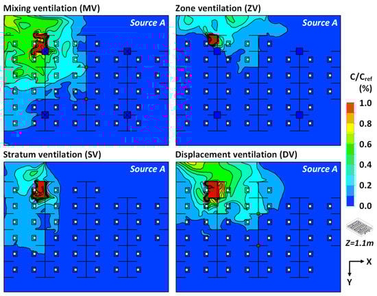 Distribution of relative pollutant concentration (C/Cref) at the plane of Z = 1.1 m under different ventilation modes of MV, ZV, SV and DV and infected source of A (with a height of physical barrier of 0.6 m).