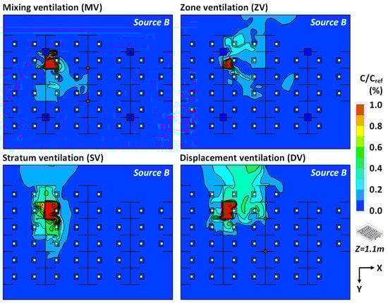 Distribution of relative pollutant concentration (C/Cref) at the plane of Z = 1.1 m under different ventilation modes of MV, ZV, SV and DV and infected source of B (with a height of physical barrier of 0.6 m).