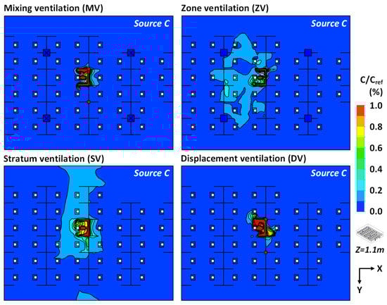 Distribution of relative pollutant concentration (C/Cref) at the plane of Z = 1.1 m under different ventilation modes of MV, ZV, SV and DV and infected source of C (with a height of physical barrier of 0.6 m).
