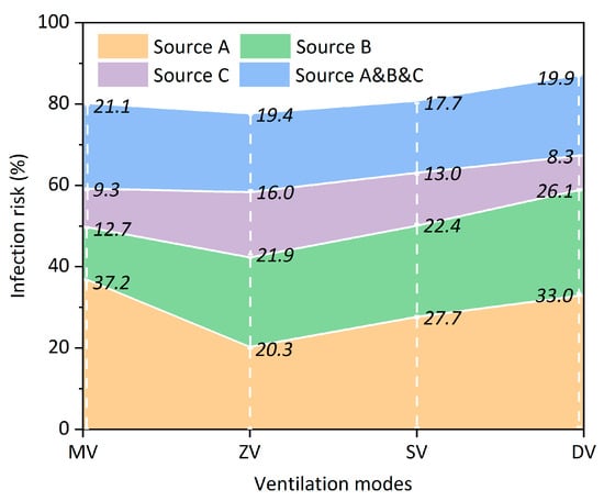 Infection risk (with exposure time of 1 h) under different ventilation modes of MV, ZV, SV and DV and locations of infected source of A, B, C and A and B and C.