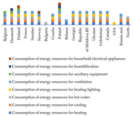 In general terms, the level of energy efficiency of the object of assessment is determined based on the characteristics of consumption or the consumption of energy resources. Comparative characteristics of materials related to the consumption of energy resources in different countries showed certain differences. These include the following: of total building energy consumption, 89% of the countries in the sample surveyed include heating, 84% of countries include hot water, 79% of countries include cooling, 74% include lighting, and minimum countries account for auxiliary equipment; 21%, household electrical appliances; 16% and air humidification; 11% (