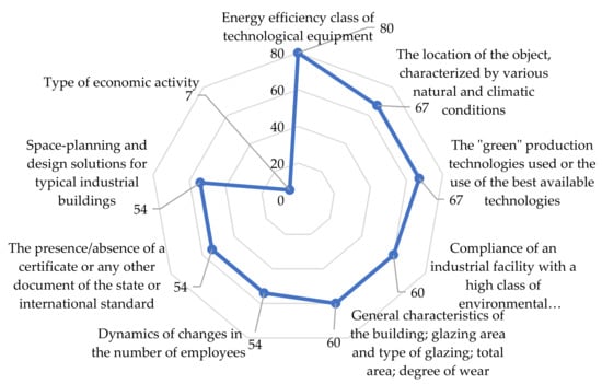 According to experts, the most significant conditions include: the location of the assessment object to take into account the natural and climatic features of the territory (67% of experts); general characteristics of the building (year of construction, number of stories), glazing area and type of glazing, area, degree of wear (60% of experts); space-planning and design solutions for typical industrial buildings (54% of experts). Taking into account the specifics of an industrial facility as an object for the production of industrial products, the experts noted the need to take into account the energy efficiency class of technological equipment (80% of experts) and the used “green” production technologies or the use of the best available technologies (67% of experts). Focusing on modern environmental trends, they recommended taking into account the compliance of an industrial facility with an environmental class, confirmed by the presence of a “green” certificate in one or several international systems LEED, BREEAM, DGNB and others (60% of experts) and the presence/absence of a certificate or any other document state or international standard, certifying the existence of an energy policy, strategy or energy management system at the enterprise of the industrial sector of the economy that meets the requirements of ISO 50001 (54% of experts). This emphasizes the importance of accounting in determining the energy efficiency of industrial facilities of technological processes for the production of industrial products, as well as energy efficiency and environmental friendliness management.