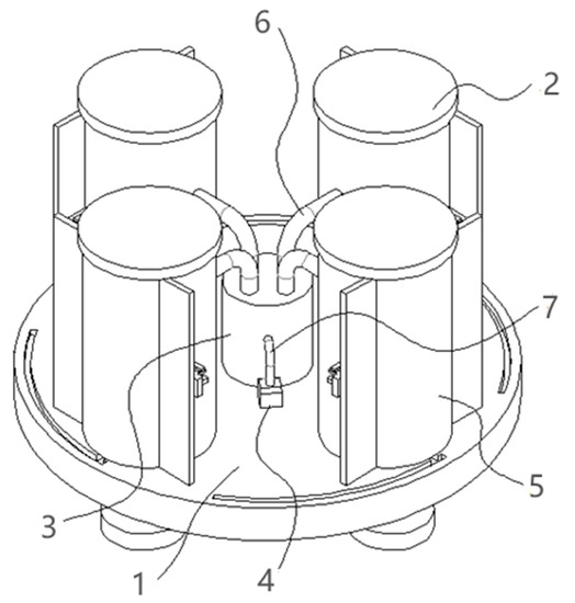 - According to the device, the sealing door can slide along the circumferential chute and the radial chute through the design of the circumferential chute, the radial chute, the sealing door, the second limiting hole, the first limiting hole and the limiting clamping strip, so that the flexible movement of the sealing door on the base is realized, the occupied space of the sealing door is greatly reduced and the utilization rate of space is greatly improved.