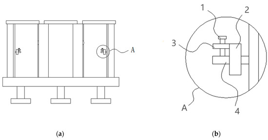 Schematic side view of energy saving device of vacuum refrigerator. (a) schematic side view of energy-saving device of vacuum freezer with closed sealing door; (b) partial enlarged schematic diagram of area A. 1—limit clip, 2—first mounting plate, 3—second mounting plate, 4—positioning plate.