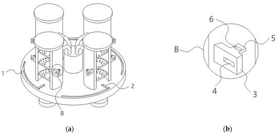 Schematic diagram of the structure of the energy-saving device of the vacuum refrigerator (the sealing door is not shown). (a) Structural schematic diagram of the energy-saving device of the vacuum freezer without the sealing door; (b) partial enlarged schematic diagram of area B. 1—circumferential chute, 2—radial chute, 3—first mounting plate, 4—mounting groove, 5—second mounting plate, 6—second limiting hole.