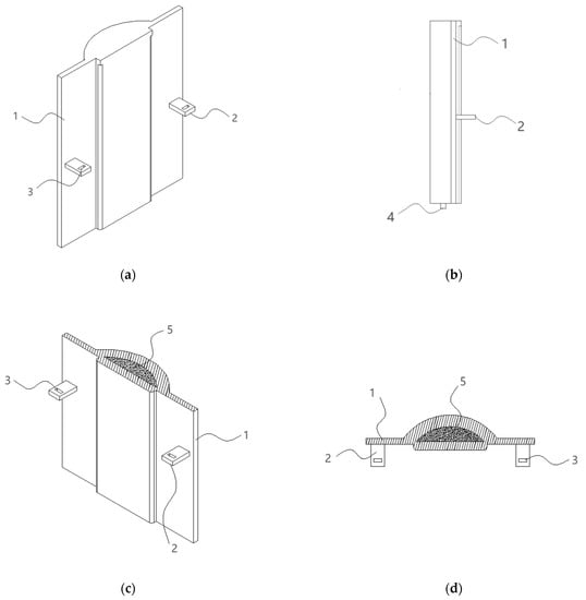 Schematic diagram of related structure of sealing door. (a) Front view; (b) side view; (c) interior view; (d) top view. 1—support plate, 2— positioning plate, 3—first limit hole, 4—limit slider, 5—insulation layer.