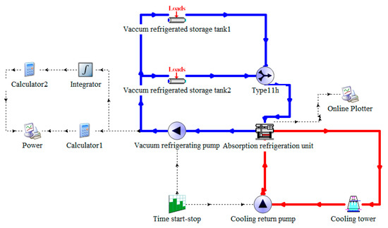 In this paper, the absorption refrigeration unit adopts type-107, the vacuum refrigeration pump and cooling circulating water pump adopt type-114, the vacuum refrigeration storage tank adopts type-682, the time starter and stop adopts type-14 h, the real-time display and power adopt type-65c, the cooling tower adopts type-51b and the type-11 h is the combined three-way valve, which is used to transfer the chilled water in the absorption refrigeration unit. Furthermore, the shunt flows through the vacuum freezing storage tank and then recombines together to achieve the purpose of chilled water circulation.