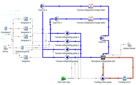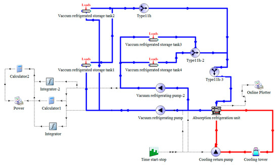 The TRNSYS 16 simulation connection diagram is constructed according to the structure shown in Figure 1. This is the first scheme, which has a set of absorption refrigeration units and a single vacuum refrigeration pump, and the simulation connection diagram is shown in Figure 5.