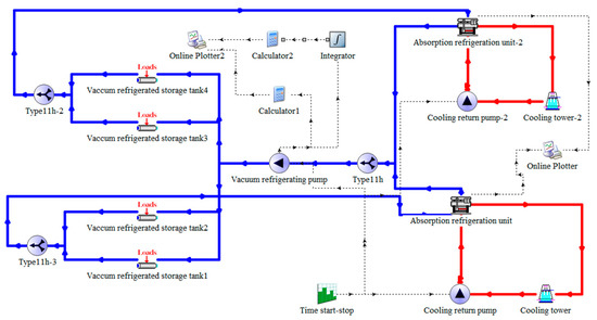 Then, the simulation connection diagram of Scheme 3 and Scheme 4 is constructed. Scheme 3 has two groups of absorption refrigeration units and a single vacuum refrigeration pump, and its simulation connection diagram is shown in Figure 7 below. Scheme 4 has a set of absorption refrigeration units and two vacuum refrigeration pumps, and its simulation connection diagram is shown in Figure 8 below.