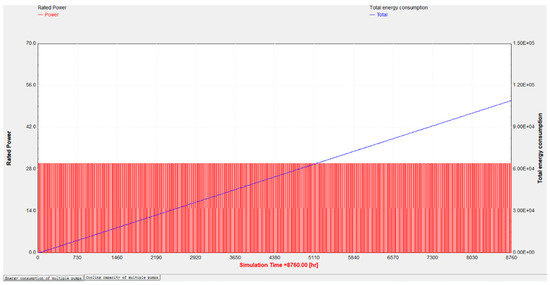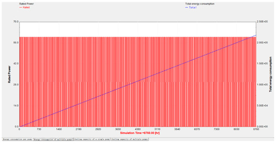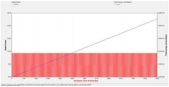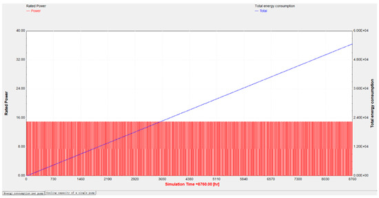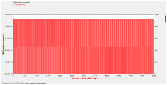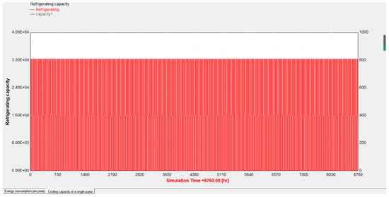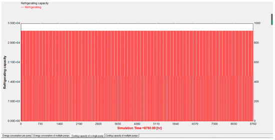 - According to the simulation Scheme 1 of TRNSYS 16 software, when the rated power of a vacuum refrigeration pump is 15 kW, it can be concluded that the annual cumulative energy consumption of a group of absorption refrigeration units corresponding to a single vacuum refrigeration pump is 54,750 kWh, as shown in Figure 9. At the same time, it can be concluded that the annual refrigerating capacity of a single vacuum refrigeration pump is 32,400 kW, as shown in Figure 10.