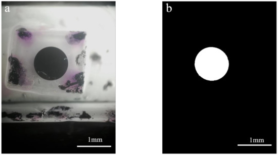 The single complete image acquired by the MISS sensor is exhibited in Figure 5a. Firstly, the image is grayed and opened to eliminate the influence of the interference point in the marked circle area. Then the grayscale image is binarized to obtain an image containing only the marked circle, as shown in Figure 5b.