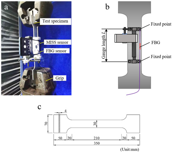 Figure 7 presents detailed diagrams of mounting sensors on the metal specimen. The photo of the MISS sensor and FBG sensor mounted on the metal specimen is revealed in Figure 7a. Both the MISS sensor and the FBG sensor were fixed on the surface of the metal specimen. As illustrated in Figure 7b, the fixed points of the MISS sensor were the same as those of the FBG, in order to ensure that the strain range of strain occurring in the specimen measured by both sensors is consistent. The gauge length of the MISS sensor is defined as the distance between the centers of the two supports. The MISS sensor with a gauge length of 100 mm was used for the metal tensile test. Figure 7c shows a technical diagram of the metal specimen.