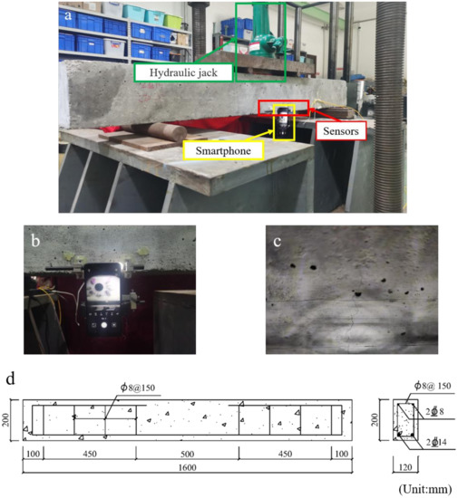 Detailed diagram of the reinforced concrete beam test. (a) Photo of the test setup; (b) Detailed photo of the sensors mounted on the RC beam; (c) Photo of cracks in the measurement region; (d) Reinforcement diagram of RC beam.