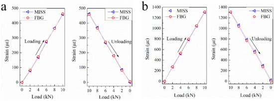 FBG sensors are considered to have high accuracy in measuring structural strain, so a comparison experiment was conducted using the FBG sensor to verify the accuracy of the MISS sensor. Figure 10 shows the comparison of two results of structural strain under the condition of staged loading. For each test, the load was increased from 0 to 10 kN with an increment of 2 kN.