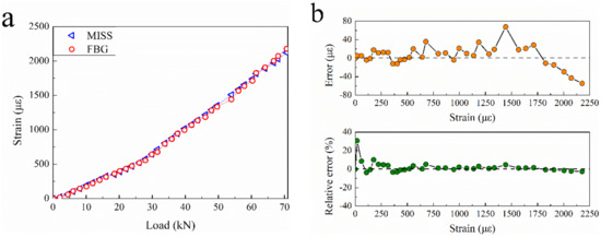 The mean strain obtained by the MISS sensor within the gauge length of the concrete beam is shown in Figure 12. Where a gives the response curve of the load, b gives the absolute error measured and relative error measured by the MISS sensor and the FBG sensor.