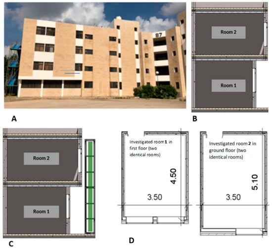 (A) View the building under investigation, (B) section in the investigated rooms without GW, (C) section in the investigated rooms without GW, and (D) plan of the investigated rooms (two identical rooms in each floor).