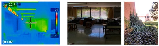 During the measurement period (23 November to 6 December) the weather was mostly clear with some cloudy days. The mean ambient temperature (Ta) was 18.3 °C and the highest recorded Ta was 21 °C (Field measurements with Extech HD300 tool, manufactured by FLIR Commercial Systems Inc., Nashua, NH, USA, Table 2). The mean recorded relative humidity (RH) was 46%. During the measuring period, the ambient temperature of the cavity (the distance between the green wall and the building’s bare wall) was 0.2 °C lower than the ambient temperature of the location on average, and the relative humidity close to the green wall (within the cavity) was greater than the surrounding by an average of 4%.