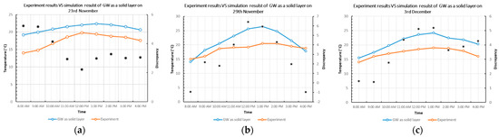 Comparison of experiment results to simulation results of GW as a solid layer during the experiment period. (a) 23 November, (b) 29 November, (c) 3 December.
