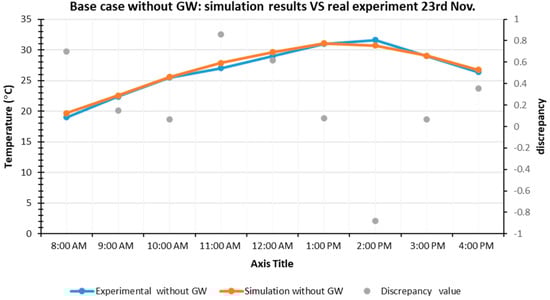 In addition, simulation results of external surface temperature of the walls without GW were compared to the experimental exterior surface temperature of the base case in the studied period. The compared results show good agreement and the potential of the simulation setting to study new variables.