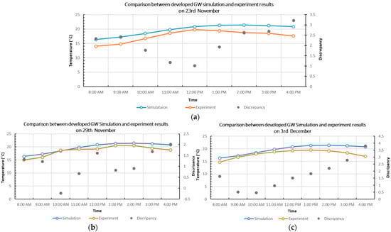 Simulation with the developed new modules vs. experimental on (a) 23 November and (b) 29 November and (c) 3 December.