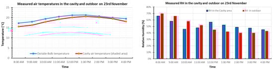 (Left) Result of field measurement; outside-bulb temperature and cavity air temperature on 23 November, (Right) relative humidity in the cavity area and the outdoor.