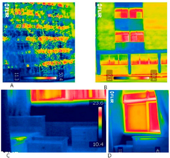 Thermal image of Ts exterior wall for ground floor rooms, covered with green wall (A), without green wall (B), Thermal images for Ts interior walls, covered with green wall (C), and interior wall for ground floor rooms not covered with GW (D).